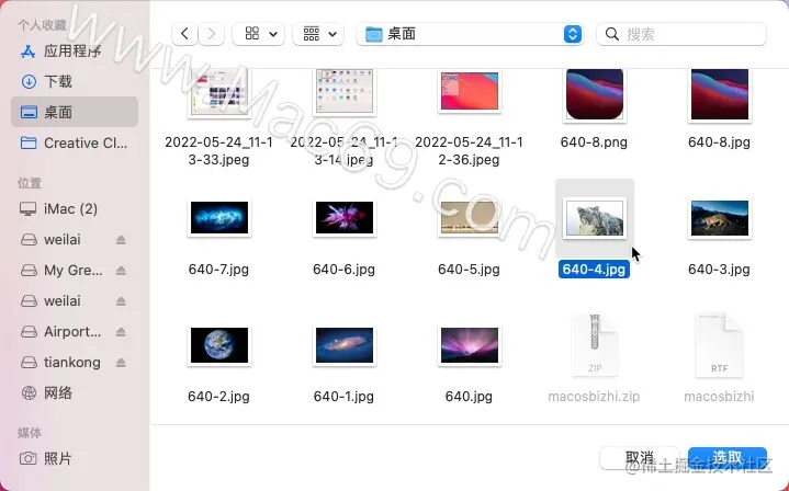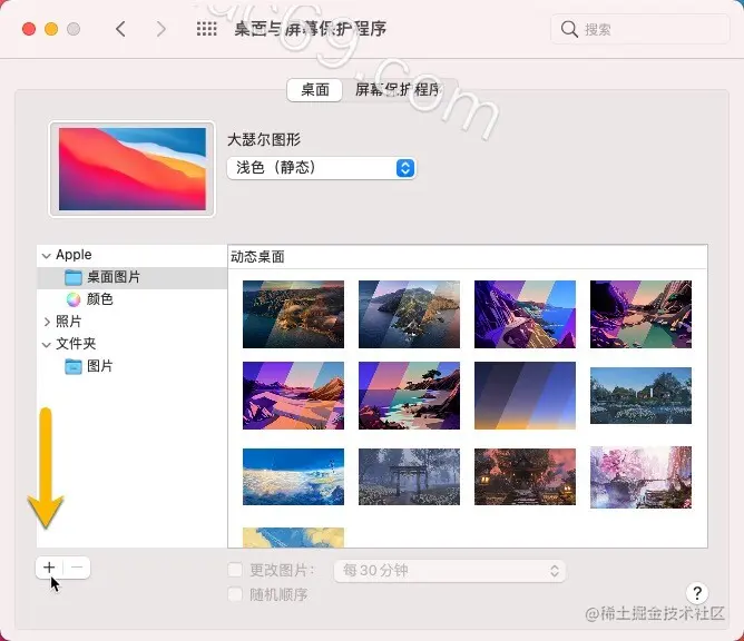 「新手入门」Mac电脑如何更换桌面壁纸? Windows阿咪 2022-05-25 3,317 阅读1分钟 怎样更换Mac电脑的桌面壁纸?电脑桌面壁纸换成自己喜欢的图片不仅能让自己的心情愉悦,还能提高工作效率。下面小编分享Mac电脑如何自定义桌面壁纸。 注意:资深Mac用户可忽略 1.首先把想要设置成壁纸的图片放在桌面上,打开Mac电脑的「系统偏好设置」。 2.找到「桌面与保护程序」选项。 3.选择「桌面」选项,可以选择macOS系统自带桌面壁纸进行更换 ,也可以点击左下角的「+」号自定义桌面壁纸。 4.找到需要设置成壁纸的图片,选中图片后,点击右下角的「选取」,即可完成。