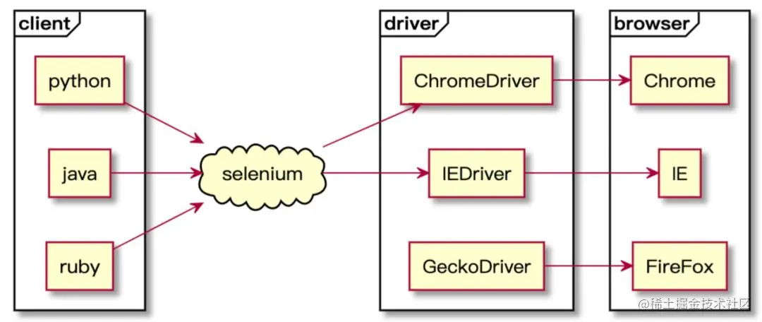 在客户端(client)完成 Selenium 脚本编写,将脚本传送给 Selenium 服务器,Selenium 服务器使用浏览器驱动(driver)与浏览器(browser)进行交互。