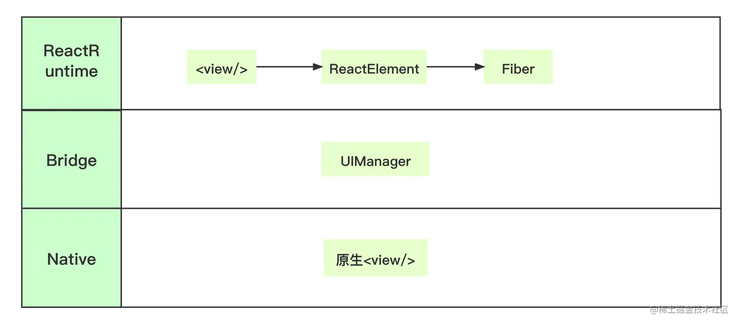 一个<View/>标签,先被转写为ReactElement,然后得到fiber节点,再在遍历fiber时通过UIManager经由bridge创建对应的原生视图、设置视图的父子关系,并最终在布局线程中计算布局、主线程更新布局。