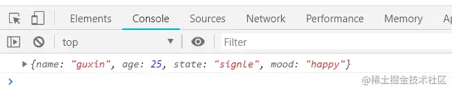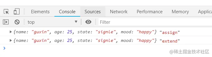 我们可以看到source上的state属性合并到了target对象上。如果只是想将两个或多个对象的属性合并到一起,不改变原有对象的属性,可以用一个空的对象作为target对象。像下面这样: