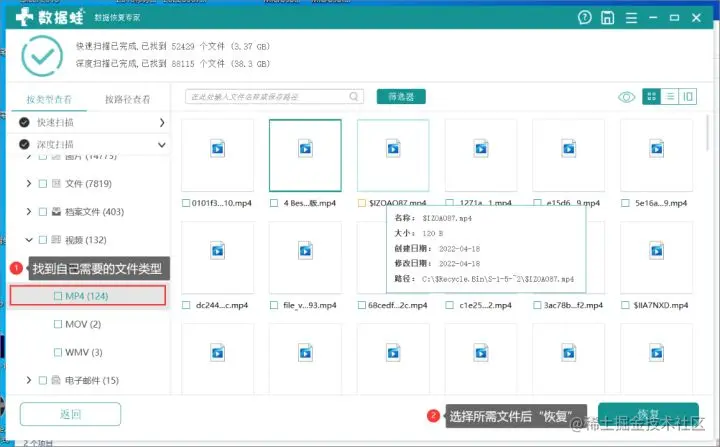 3)扫描完成后,在扫描结果中找到你丢失的文件,随后就可以点击“恢复”了!