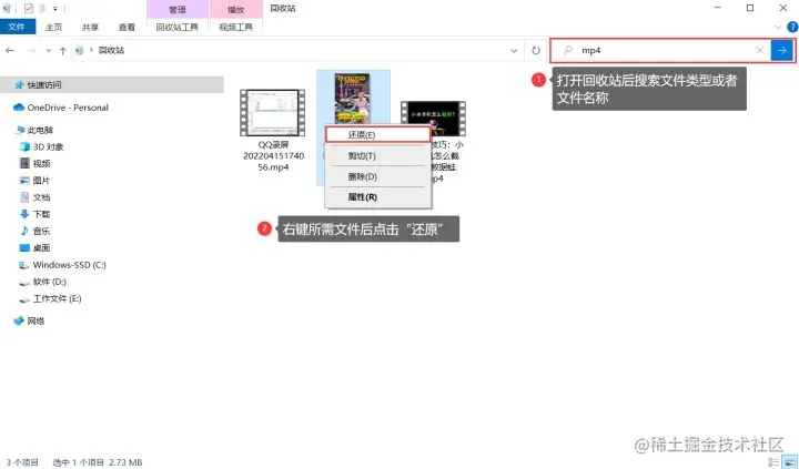 其实任何文件,只要是用鼠标右键删除的话,那就等于只是删除了它显示在电脑内的图标,而这些文件都会在回收站里面存放,所以如果你的视频删除之后,可以在回收站里面试着找一下,如图: