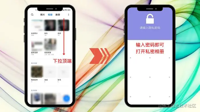 第2步:随后在“相册”界面的顶部下拉,这时就会将隐藏起来的私密相册给打开了,用密码解锁后即可进入;