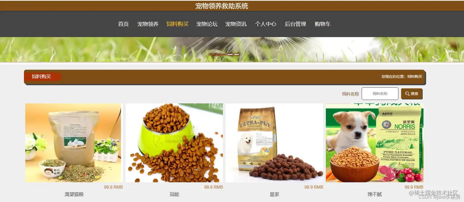 系统首页: 宠物领养饲养交流管理平台,在系统首页可以查看首页、宠物领养、饲料购买、宠物论坛、宠物资讯、个人中心、后台管理、购物车等内容