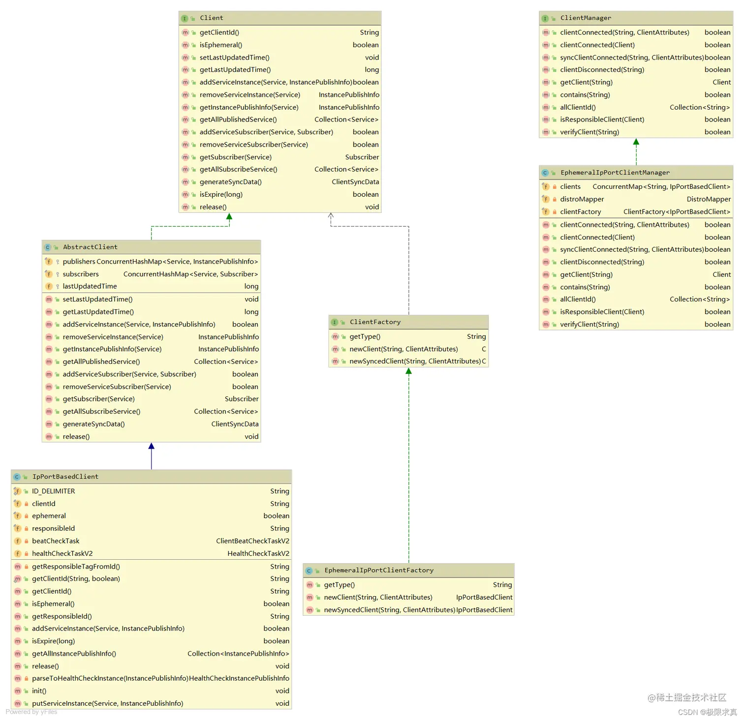 官方对Client说明: The abstract concept of the client stored by on the server of Nacos naming module. It is used to store which services the client has published and subscribed The client is bind to the ip and port users registered. It's a abstract content to simulate the tcp session client.简单来说 服务提供者和服务消费者以及其他的集群节点都属于Client