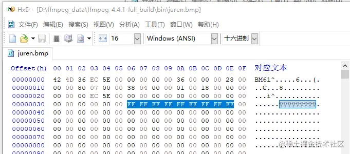 由于 BMP 格式比较简单,所以使用 HxD 即可,这是一个 16进制查看器,功能非常强大,用 HxD 打开 juren.bmp 图片,如下:
