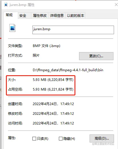 第 3~6 个字节是BMP文件的大小,在本文里面是 0x5EEC36 ,注意,数据类型存储是 小端存储的,看 HxD 的时候,需要从右往左看。0xEC36 缓换成 十进制 就是 6,220,854 字节,这个值跟 文件属性是可以对得上的,如下图: