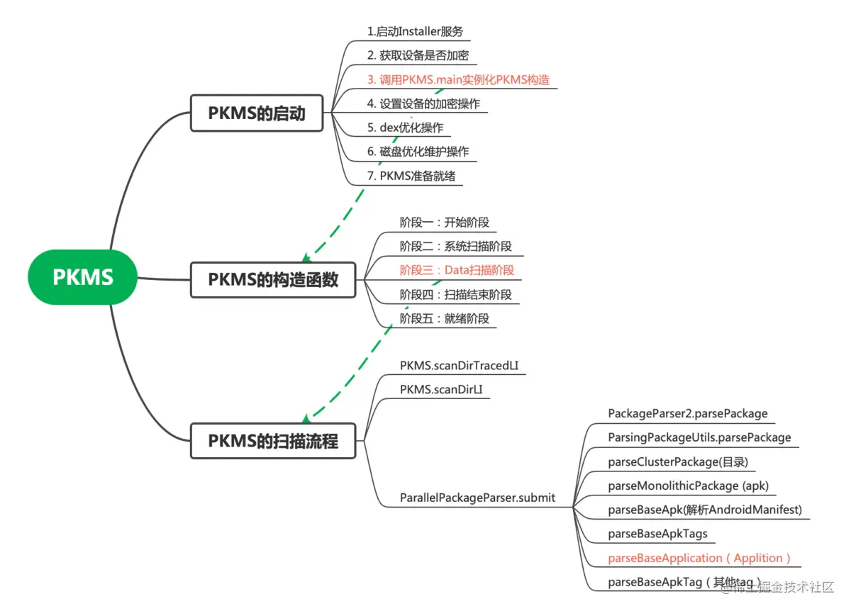 packageManagerService作为系统的核心服务,其作用是:对应用进行安装、卸载和信息查询。此篇文章分析PKMS的启动流程,其启动流程大致如下: