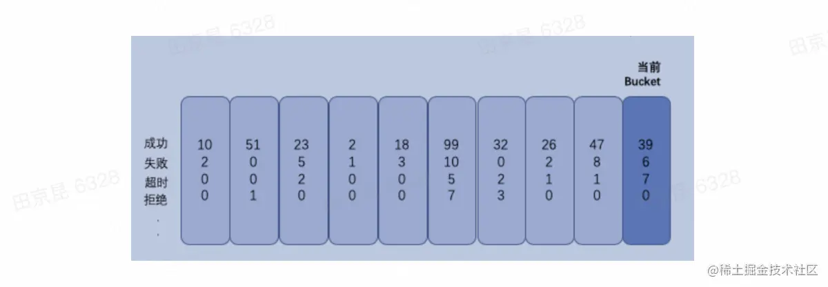 我们采用了常见的滑动窗口的方法来实现。如下图,内存中为每个调用维护一个滑动窗口,比如窗口分10个bucket,每个bucket里面记录了1s内某个rpc的请求结果数据(成功、失败、超时等等)。新的一秒到来时,生成新的bucket,并淘汰最早的一个bucket,只维持10s的数据。在新请求这个rpc失败时,根据前10s内的 失败/成功 是否超过阈值来判断是否retry。默认阈值是0.1,下游最多承受平常 1.1 倍的QPS。当然也支持用户自行设置熔断开关和阈值。