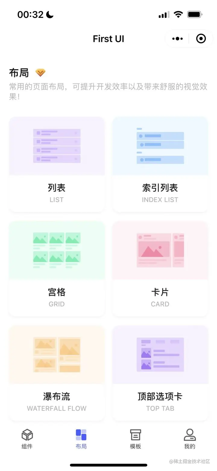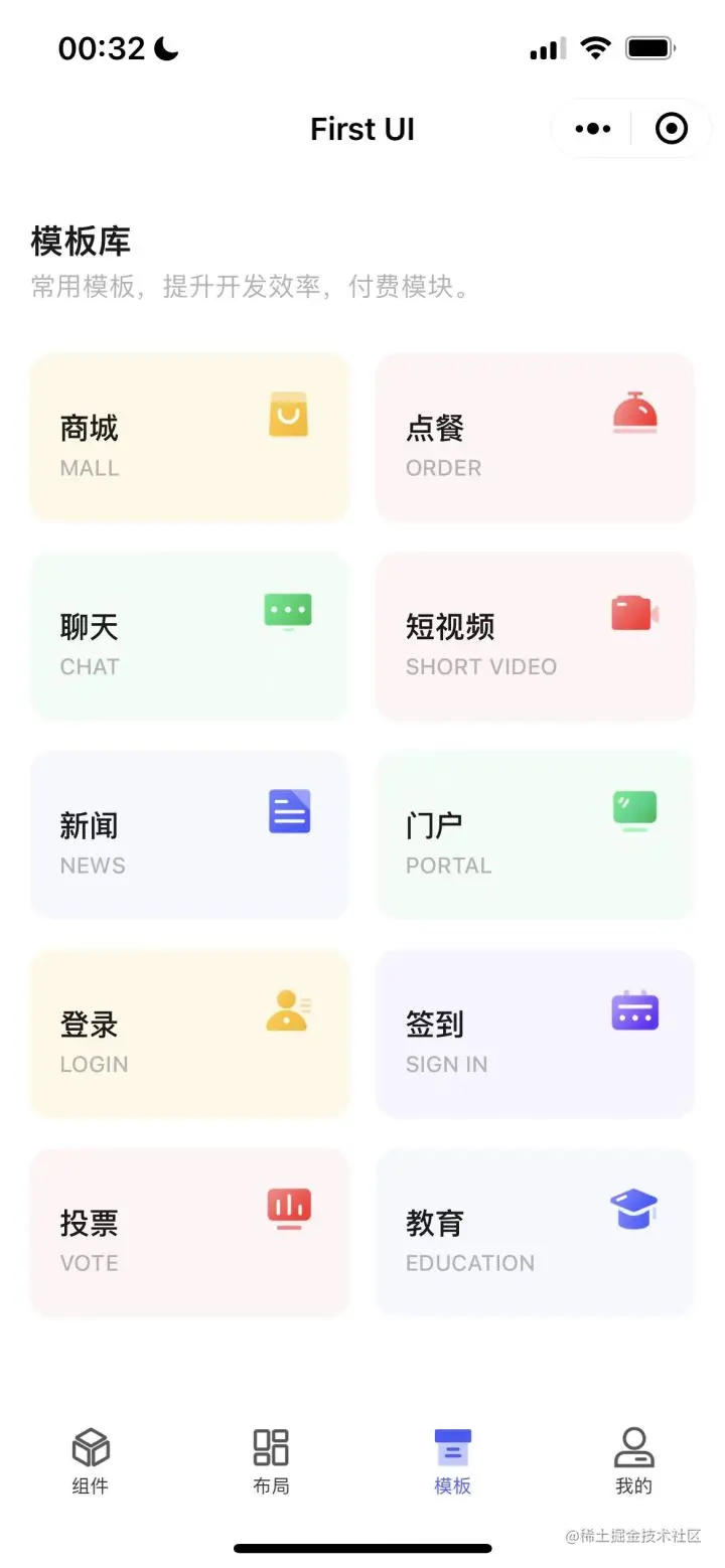 - 丰富实用的布局、模板。基于FirstUI提供的组件,针对常用场景、行业,提供丰富实用的布局和模板。