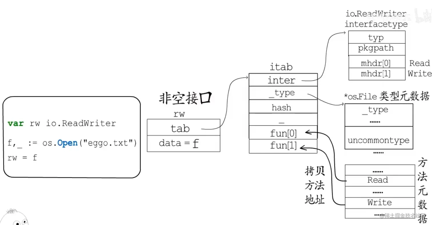 - 具体类型转非空接口时,入参 tab 是编译器在编译阶段预先生成好的,新接口 tab 字段直接指向入参 tab 指向的 itab;调用 mallocgc 获得一块新内存,把值复制进去,data 再指向这块新内存。
