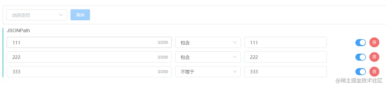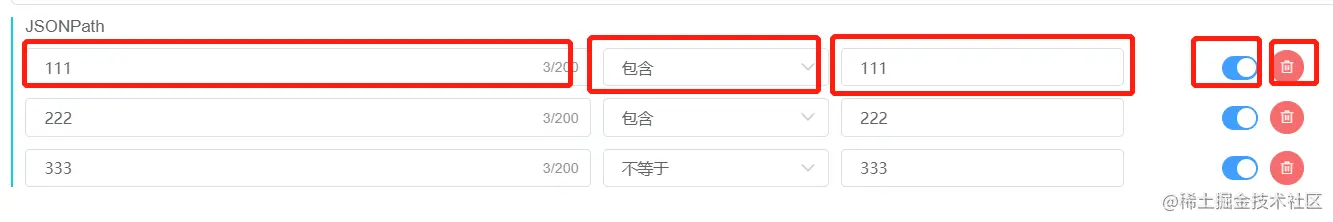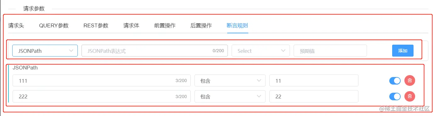 这个组件就是用于提供添加后的JSONPath的编辑功能,而且能提供断言的列表展示效果。另外还有断言的删除以及禁用等功能。
