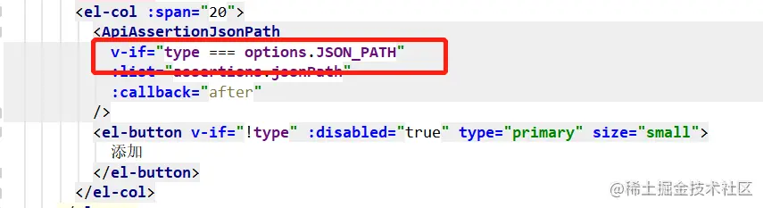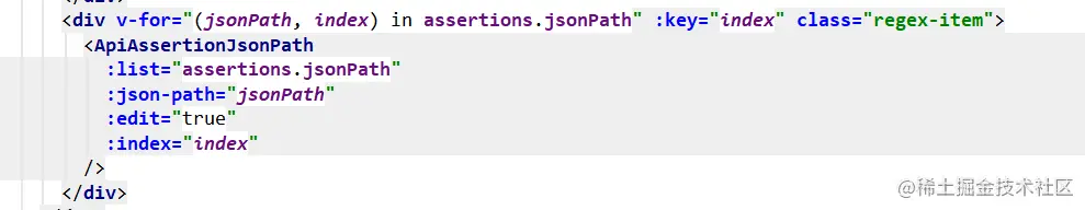 然后这里包含了子组件ApiAssertionJsonPath,这里用了v-if来判断类型,当类型值为JSON_PATH的时候才显示该组件。