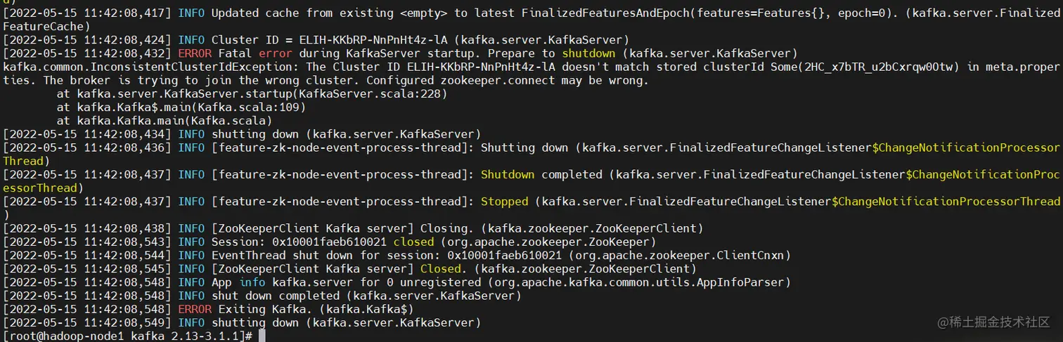 ERROR Fatal error during KafkaServer startup. Prepare to shutdown (kafka.server.KafkaServer) kafka.common.InconsistentClusterIdException: The Cluster ID ELIH-KKbRP-NnPnHt4z-lA doesn't match stored clusterId Some(2HC_x7bTR_u2bCxrqw0Otw) in meta.properties. The broker is trying to join the wrong cluster. Configured zookeeper.connect may be wrong. at kafka.server.KafkaServer.startup(KafkaServer.scala:228) at kafka.Kafka$.main(Kafka.scala:109) at kafka.Kafka.main(Kafka.scala)