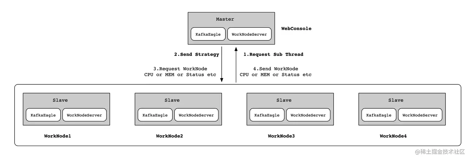 EFAK分布式模式部署,这里以5个节点为例子(1个Master和4个Slave),各个节点的角色如下如所示: