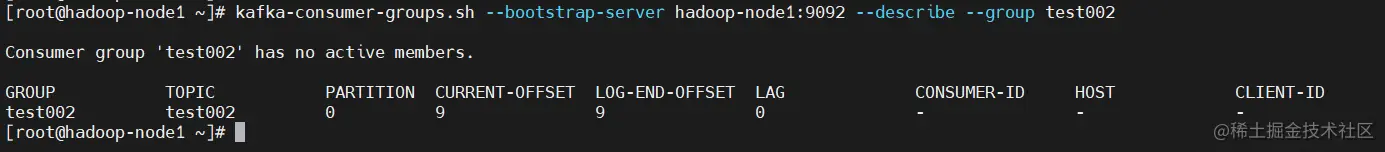 $ kafka-consumer-groups.sh --bootstrap-server hadoop-node1:9092 --describe --group test002