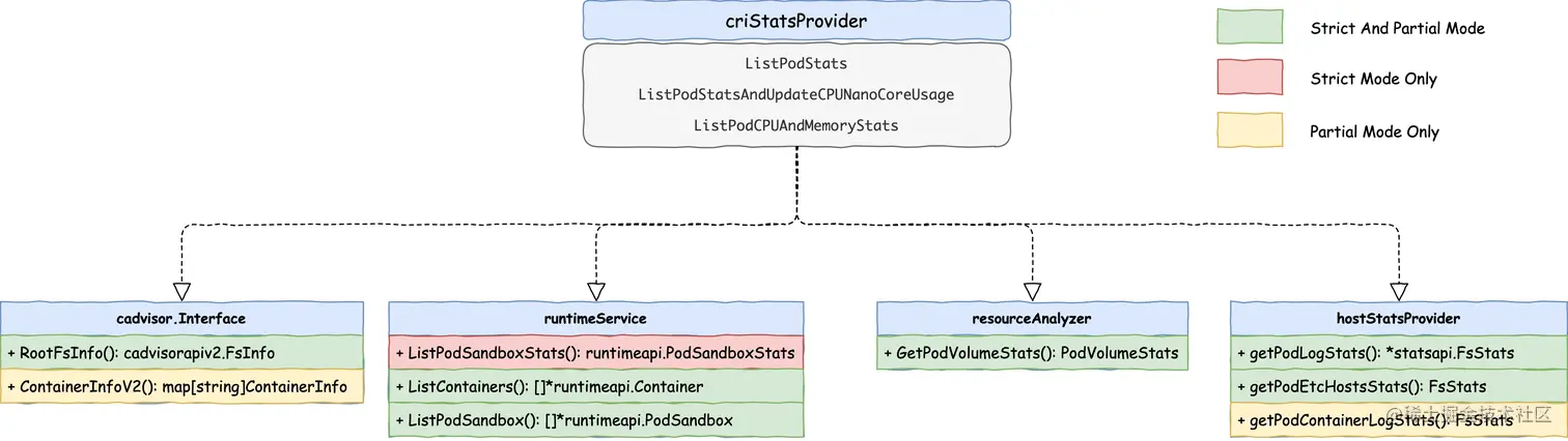 上面说到,两种StatsProvider实现的差异点仅在于Pod基础监控统计信息获取的方法上 , 这种差异被抽象出的containerStatsProvider接口本身方法不多。由于cAdvisor实现上从整体来看仅仅是将cAdvisor API返回的数据进行了组装,并不具备其他依赖,因此我们着重分析CRI实现。下面对该实现接口中的方法逐一进行比较。