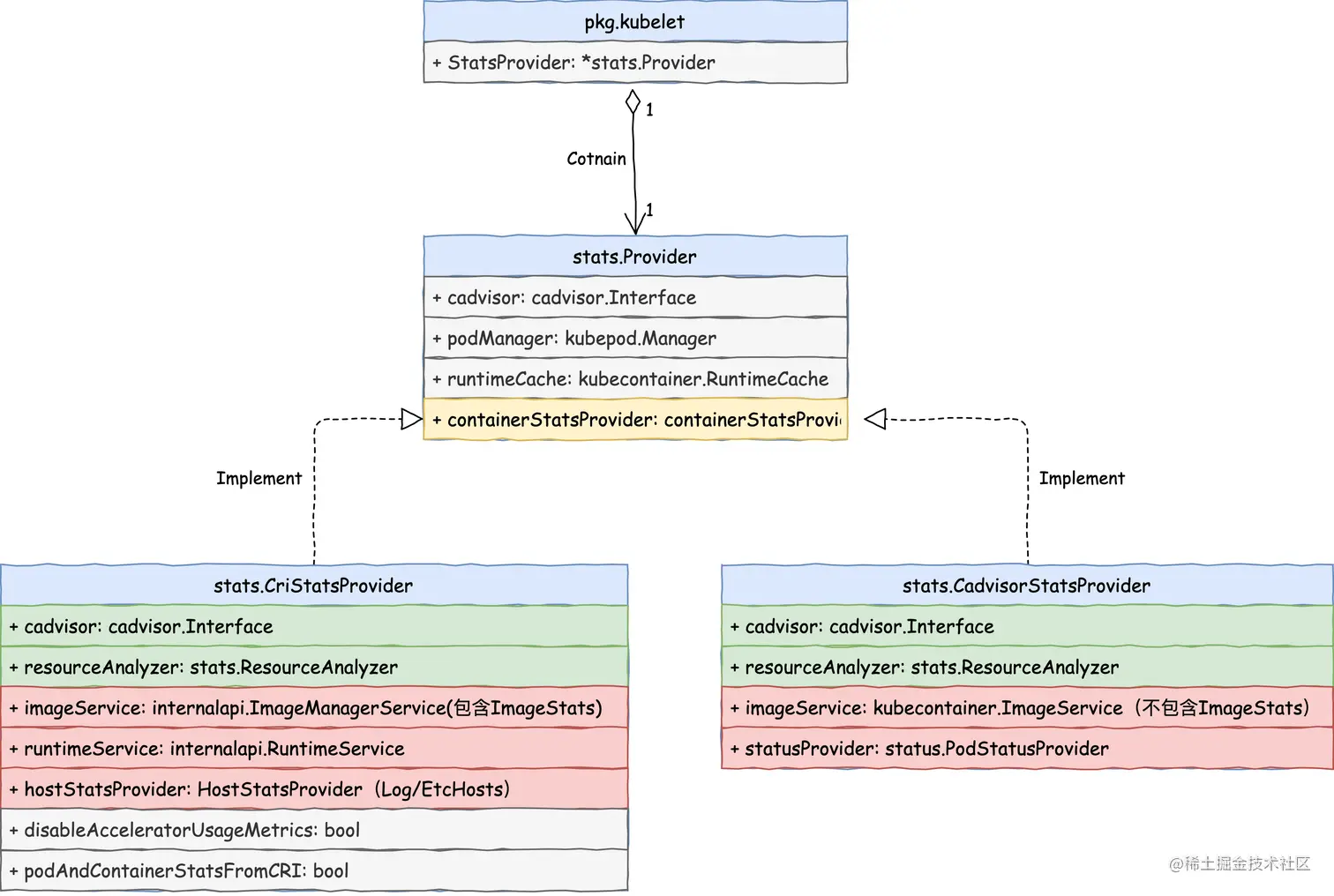 查看StatsProvider的构造器方法参数,对比前文列出的handler中的Provider接口定义,可以看出Provider接口方法除了kubelet本身实现的部分,监控相关的接口在Stats包中的实现被拆分为了几大部分: