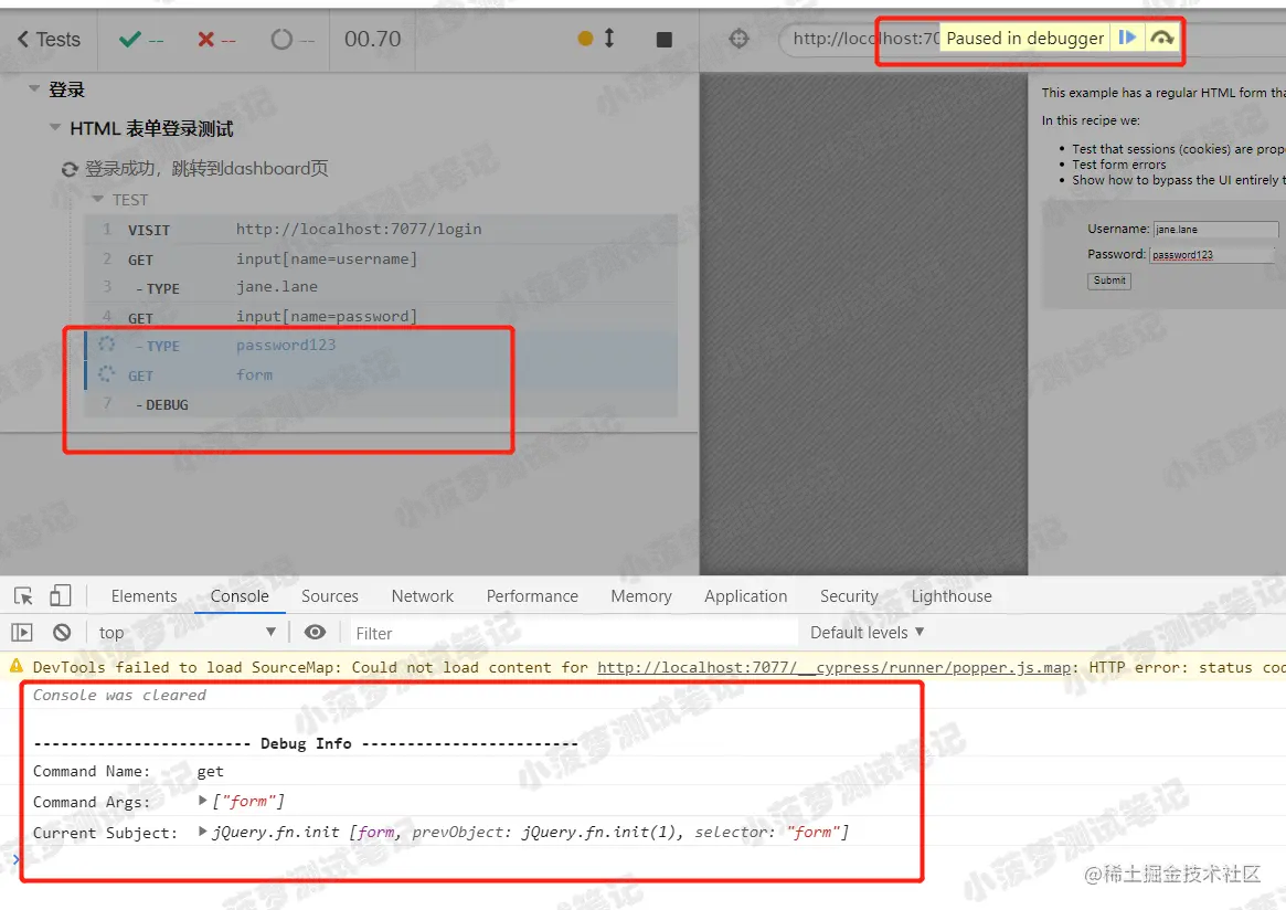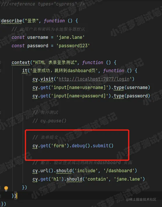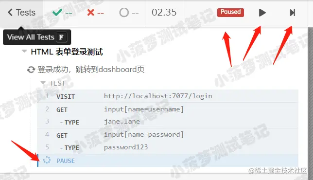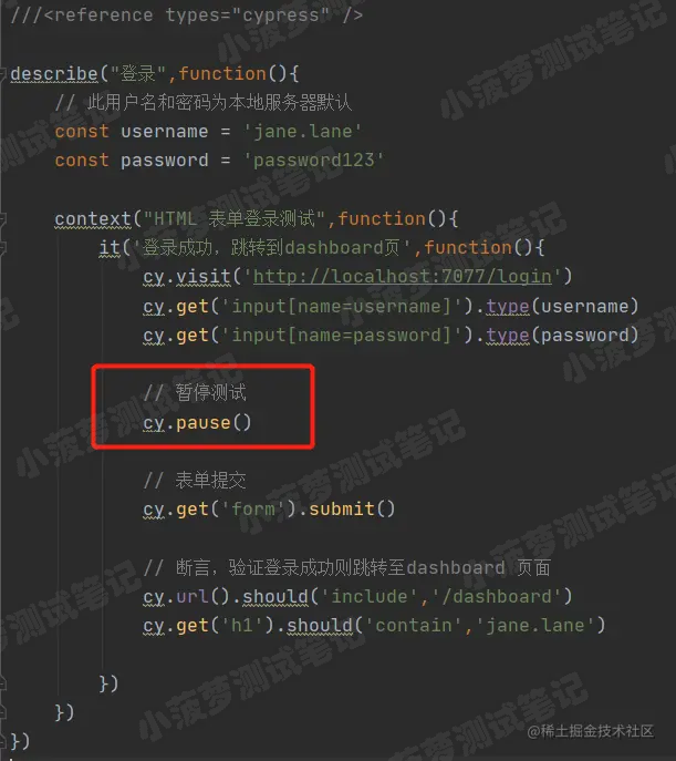 在调试测试代码时,Cypress 提供了两个命令来暂停测试运行