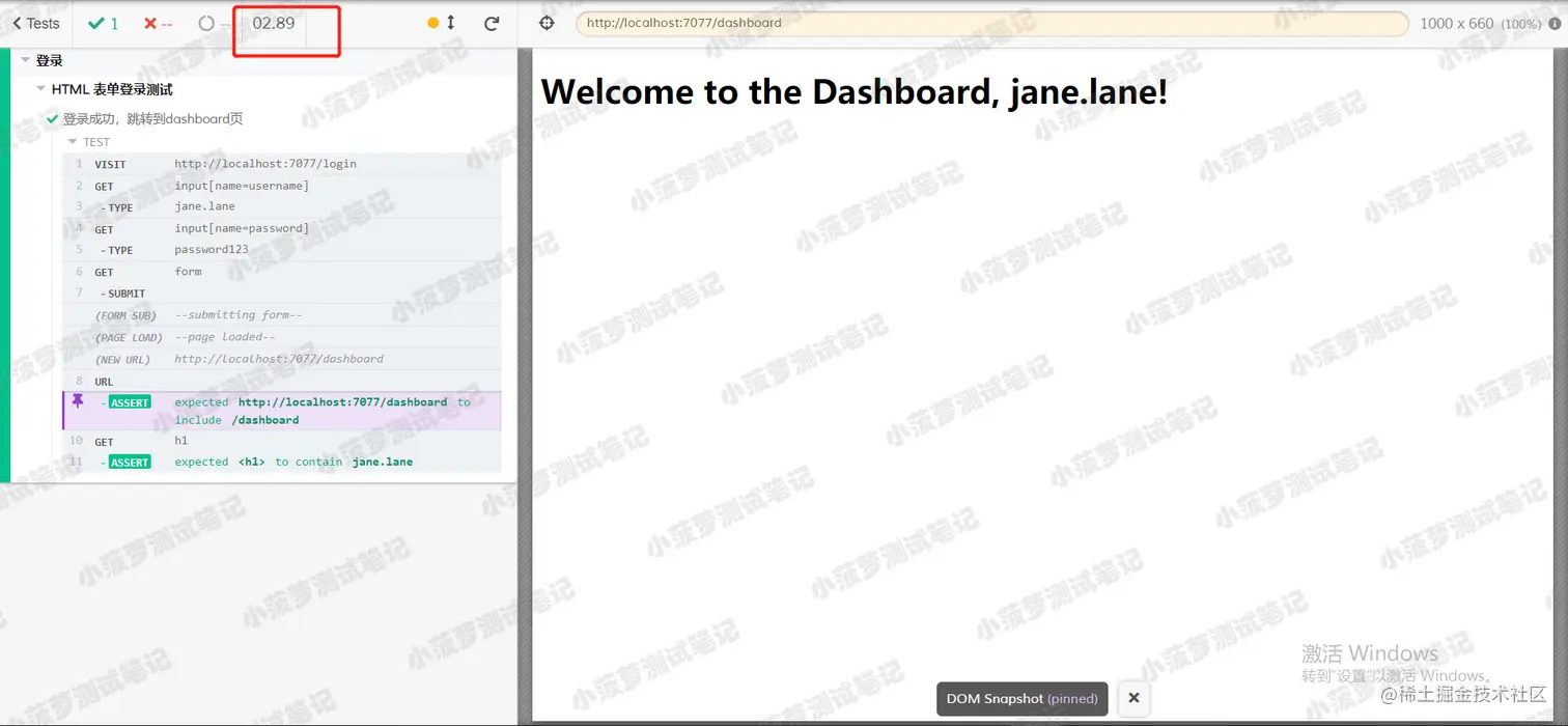 单击 testLogin.js,Cypress 会启动 Test Runner 运行测试,运行成功后,将看到运行结果页面;运行时长是真的快....