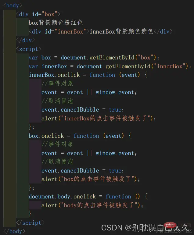 事件冒泡(Bubble): 所谓冒泡指的就是事件的向上传导,当后代元素上的事件被触发时,其祖先元素的相同事件也会被触发。在开发中大部分情况冒泡都是有用的,如果不希望冒泡发生可以通过事件对象取消冒泡 event.cancelBubble=true。