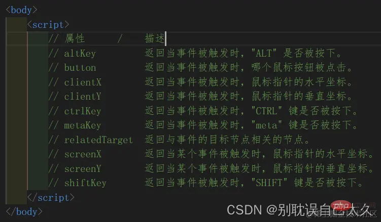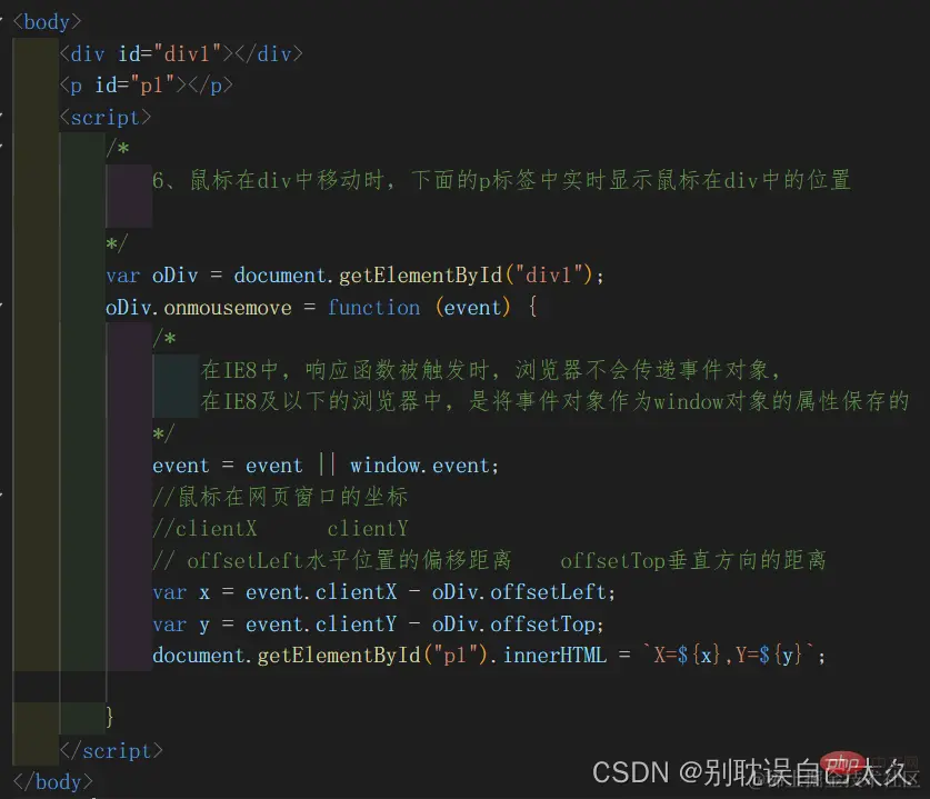 IE中的事件对象与访问 DOM 中的 event 对象不同,要访问 IE 中 的 event 对象有几种不同的方式,取决于指定事件 处理程序的方法。在IE中event对象作为window对象的属性存在的, 可以使用window.event来获取event对象在使用attachEvent()的情况下,也会在处理程序中 传递一个event对象,也可以按照前边的方式使用。这里通过一个案例来说明:当鼠标在box盒子上面的时候 ,下面p标签显示鼠标当前的坐标