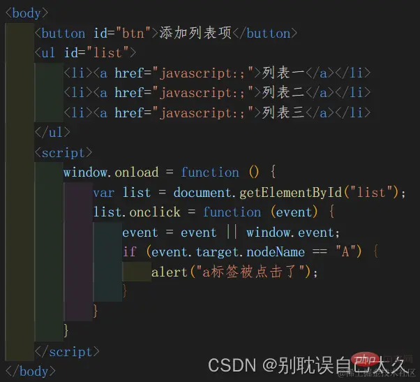 事件的委派:指将事件统一绑定给元素共同的祖先元素,这样当后代元素上的事件触发时,会一直冒泡到祖先元素,从而通过祖先元素的响应函数来处理事件。事件委派是利用冒泡,通过委派可以减少事件绑定的次数,提高程序的性能。事件对象的属性target:返回触发此事件的元素(事件的目标节点)