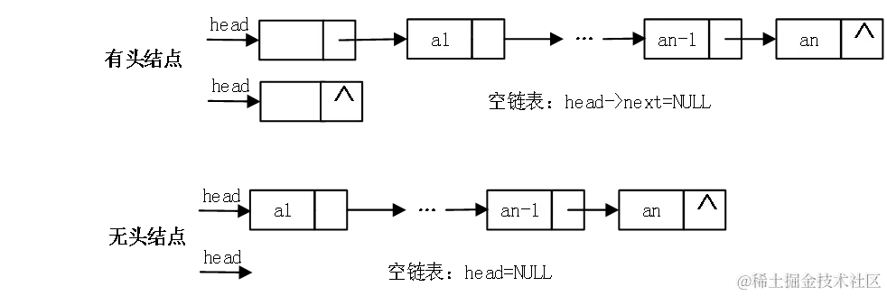 而单链表又可以细分为有头结点的单链表和无头结点的单链表,其中头结点不存储任何数据,如下图1所示。