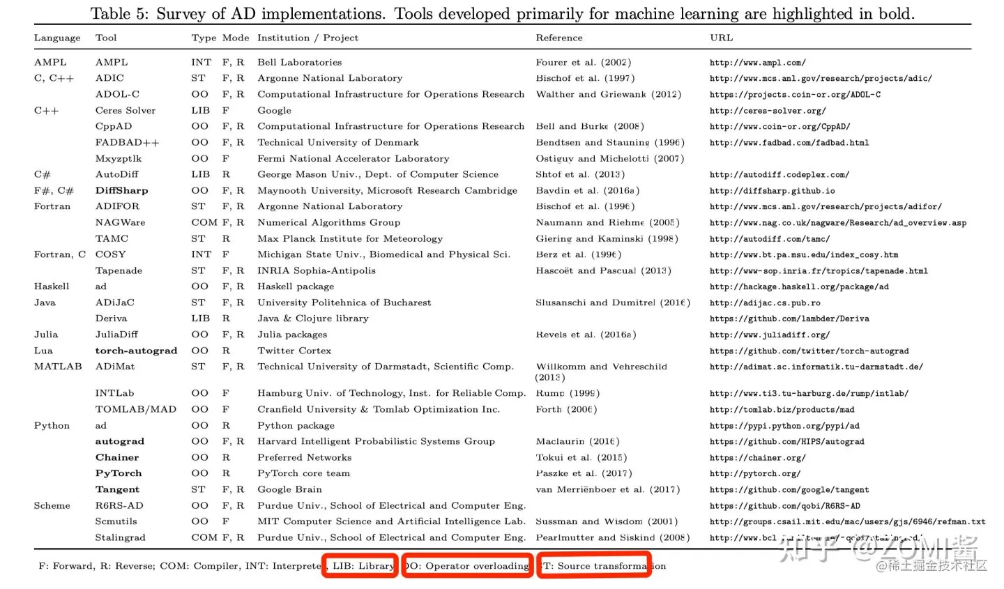 下面这个图是论文作者回顾了一些比较通用的 AD 实现。