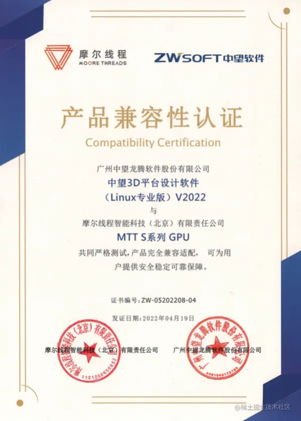 图:中望CAD 2022与MTT S系列GPU兼容性认证证书