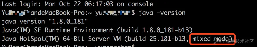在命令行中输入 java -version 可以看到,我机器上的虚拟机使用 Mixed Mode 运行模式。