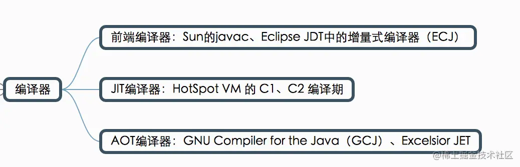 在 JVM 中有三个非常重要的编译器,它们分别是:前端编译器、JIT 编译器、AOT 编译器。
