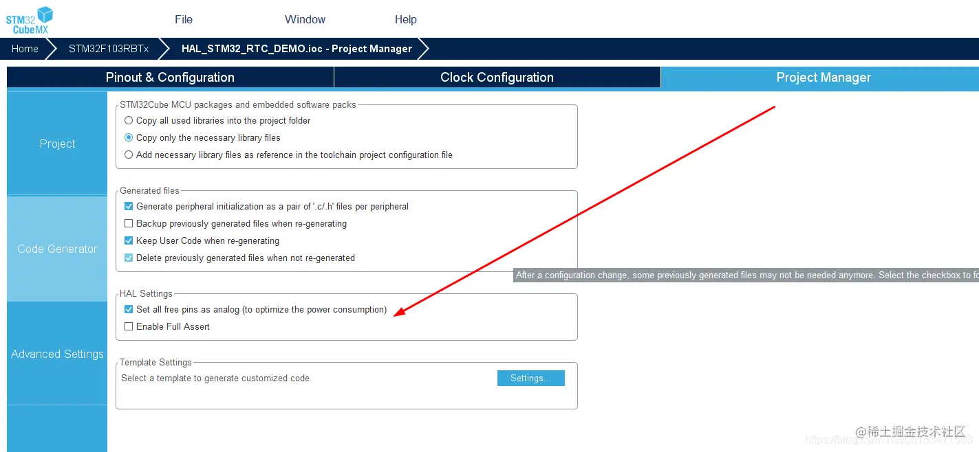 进入低功耗之前可以将引脚全部配置为浮空输入或者Anglog模式,这样最省电,如果你是用STM32CUBEMX,在这里可以看到这么一项配置就是将没有用到的引脚配置为了Anglog模式: