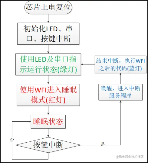 WFI指令进入睡眠模式,由于WFI睡眠模式可以使用任意中断唤醒,所以我们可以使用按键中断唤醒。在实际应用中,您也可以把它改成串口中断、定时器中断等。