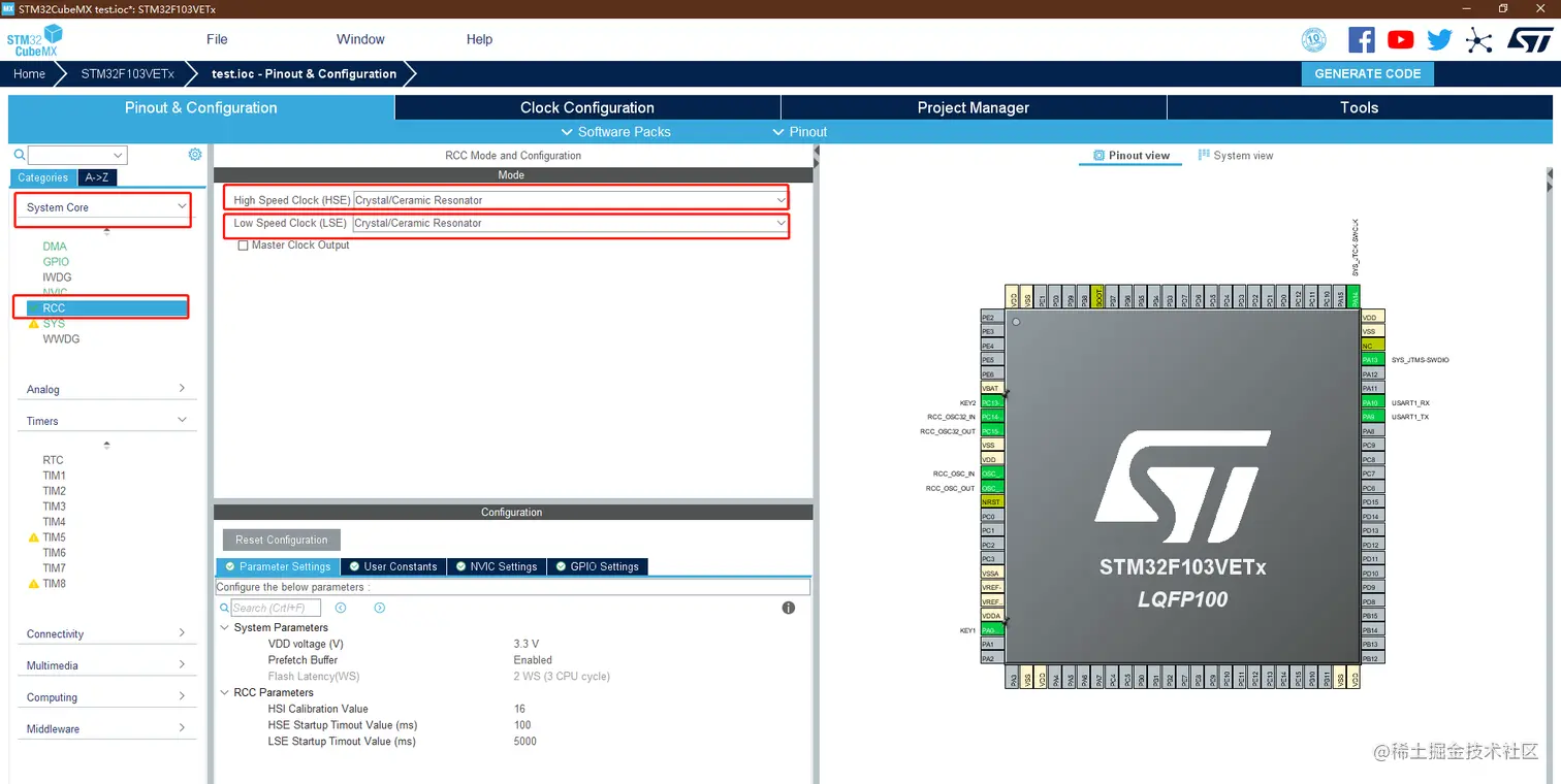 RCC 设置,选择 HSE(外部高速时钟) 为 Crystal/Ceramic Resonator(晶振/陶瓷谐振器)