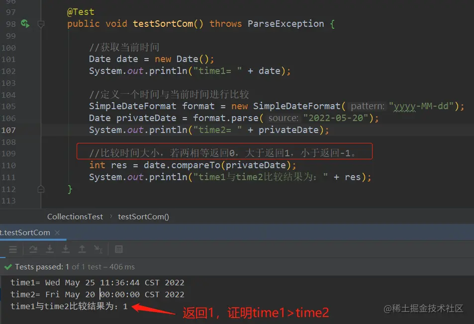 System.out.println("time1与time2比较结果为:" + res);