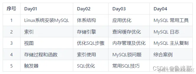 那我们简单来看一下,我们这四天分别要学习的是MYSQL高级部分的哪些内容?