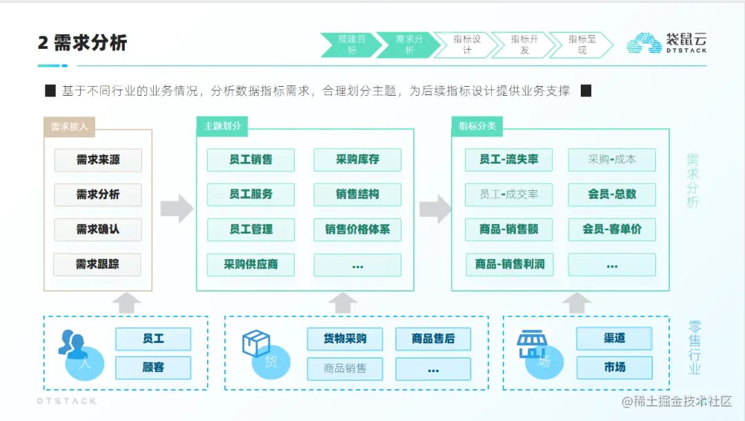 同一个企业,不同的业务线、不同的部门,甚至是同一部门的不同人员,提出来的指标计算需求都会有所不同。所以在需求分析的阶段,我们要做到基于不同行业的业务情况,分析数据指标需求,合理划分主题,才能更好地为后续指标设计提供业务支撑。
