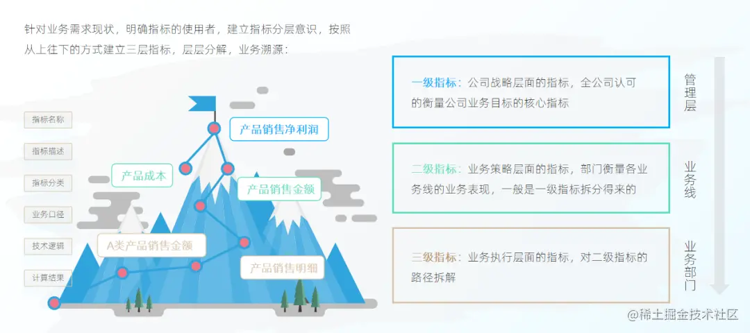 针对业务需求现状,明确指标的使用者,建立指标分层意识,按照从上往下的方式建立三层指标,层层分解,业务溯源。