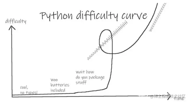 虽然小学生学习两周就能上手的 python,但是,那仅仅是前两周的学习内容,越往后那难度基本上都是指数上涨,像下图这样: