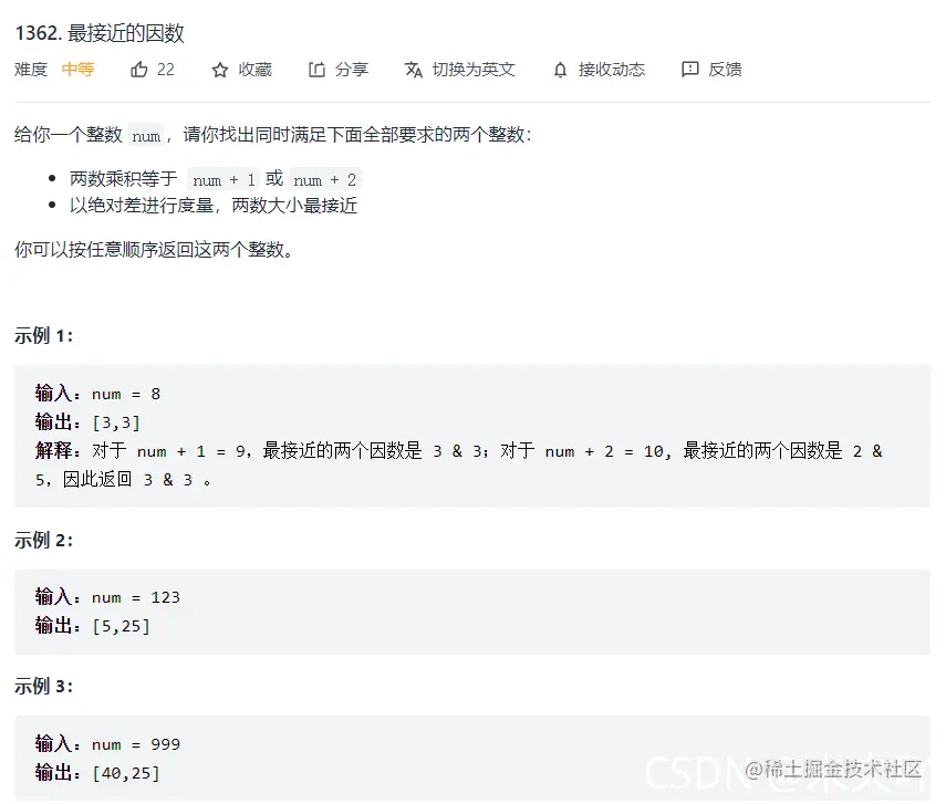 力扣https://leetcode-cn.com/problems/closest-divisors/