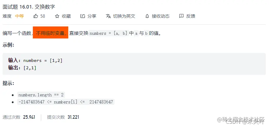 力扣16.01.交换数字 https://leetcode-cn.com/problems/swap-numbers-lcci/