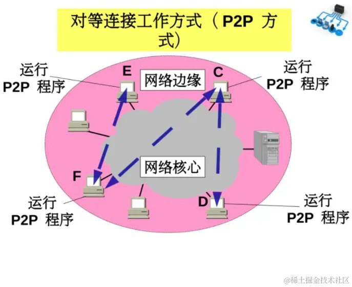 对等连接 (peer-to-peer,简写为 P2P) 是指两个主机在通信时并不区分哪一个是服务请求方还是服务提供方。 只要两个主机都运行了对等连接软件 (P2P 软件) ,它们就可以进行平等的、对等连接通信。 双方都可以下载对方已经存储在硬盘中的共享文档。