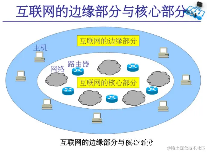 由大量网络和连接这些网络的路由器组成。这部分是为边缘部分提供服务的(提供连通性和交换)。
