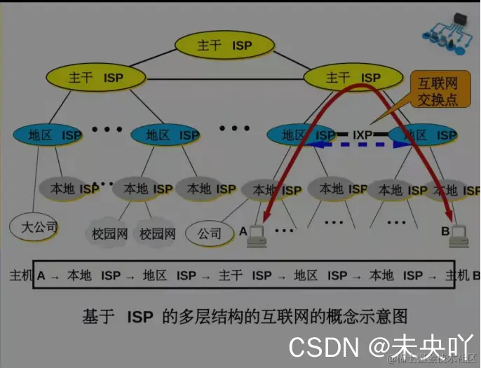 逐渐形成了多层次ISP结构的互联网;出现了互联网服务提供者ISP(Internet Service Provider);任何机构和个人只要向某个ISP交纳规定的费用,就可以从该ISP获取所需IP地址的使用权,并可通过ISP接入到互联网。;根据提供服务的覆盖面积大小以及所拥有的IP地址数目的不同,ISP也分成不同层次的ISP:主干ISP,地区ISP和本地ISP。