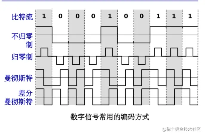 曼切斯特编码: 为周期中心的向上跳变代表0,位周期中心的向下跳变代表