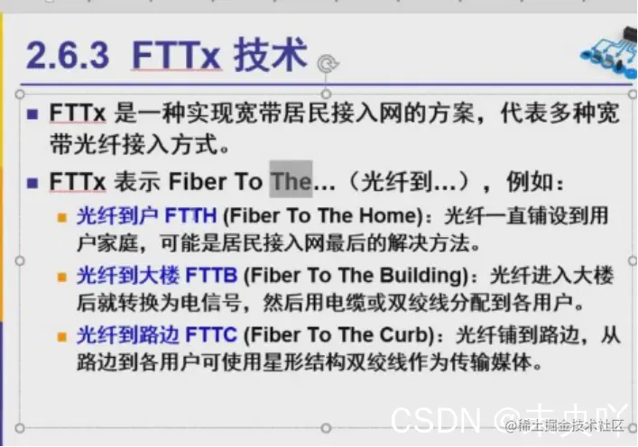 光纤到户FTTH(Fiber To The Home):光纤一直铺设到用户家庭,可能是居民接入网最后的解决方法。