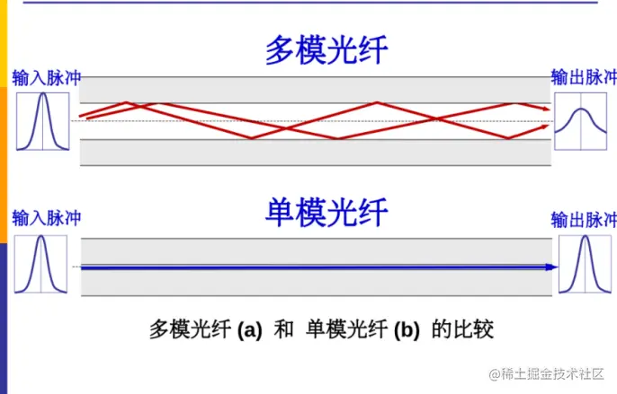 (1)多模光纤: 可以存在多条不同角度入射的光纤在一条光纤中传输