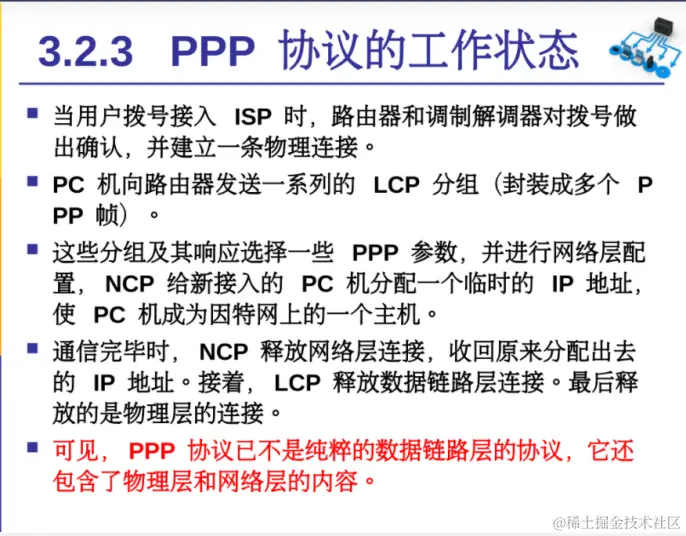LCP( Link Control Protocol), NCP(Network Control Protocol),和一个讲IP数据报封装到串行链路的方法。
