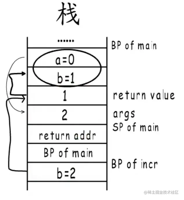 运行时用的内存栈上面的高地址,分配给函数的叫函数栈帧,栈底称为栈基BP,栈顶叫栈指针SP
